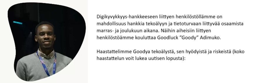 Hankkeen aikana Aitoon koulutuskeskuksessa tarkoituksena on mm. lisätä niin henkilökunnan kuin opiskelijoidenkin tietoturvaosaamista sekä henkilökunnan valmiuksia tekoälyn hyödyntämisessä. Tämän hankkeen avulla henkilökunta ja opiskelijamme oppivat lähdekriittisyyttä tekoälyn käytössä, tekoälyn käytön kohdalla hyvin kuvaava sanonta on samankaltainen kuin tulen kohdalla: ”Tuli on tunnetusti hyvä renki, mutta huono isäntä”.