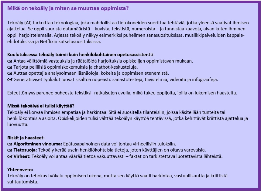 Koulutuksessa tekoäly on kuin henkilökohtainen opetusassistentti, jolla on tehokkaita työkaluja ja joka on aina saatavilla tukemaan monenlaisia oppimistarpeita.